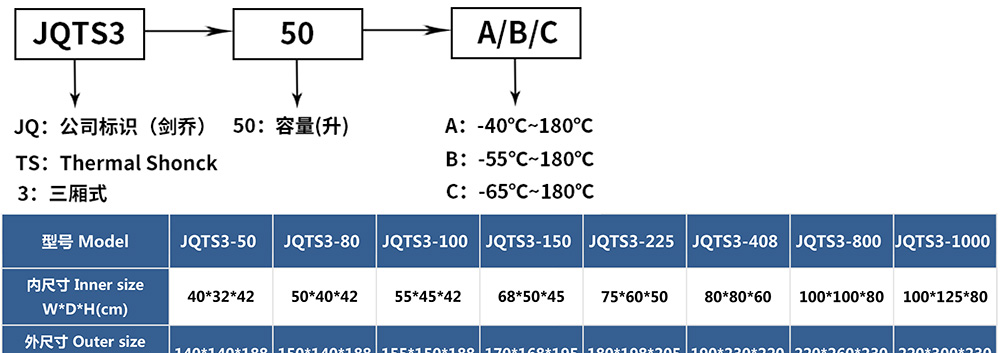 三廂式冷熱沖擊試驗箱型號命名及參數(shù)表